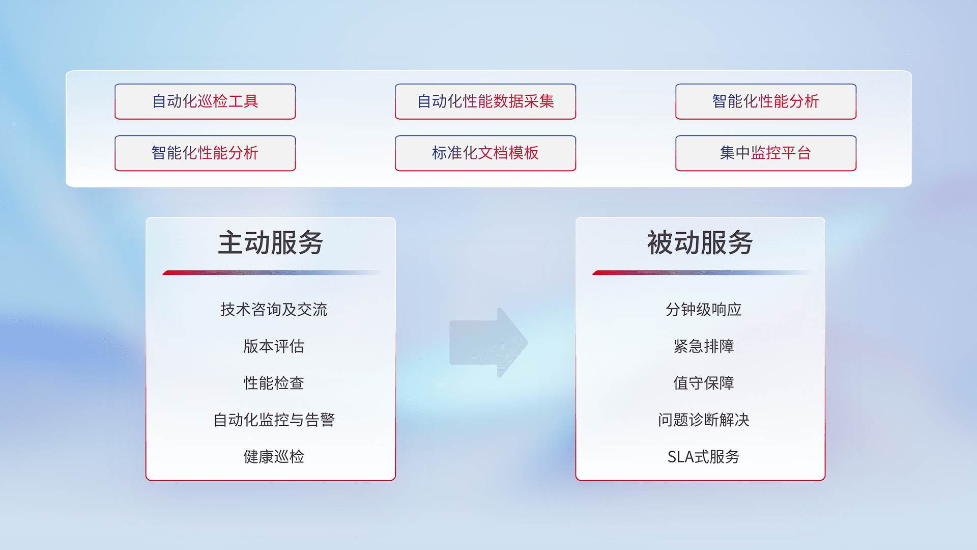 智能化工具和标准化文档,,,保障服务质量,,提供主动服务(包含技术咨询、、、、版本评估、、、、性能检查、、自动化监控与告警、、、、健康巡检)和被动服务包含(分钟级响应、、紧急排障、、、值守保障、、、、问题诊断解决、、、、SLA服务)。。