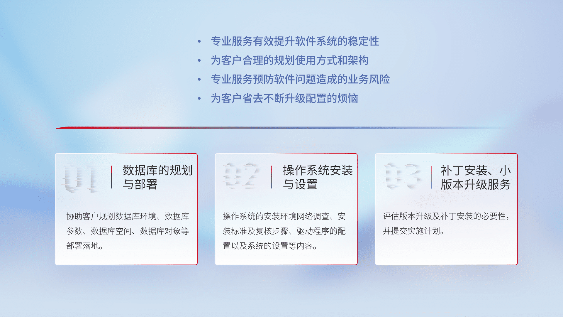 为客户提供软件规模升级、、快速部署、、、、按需配置的专业服务,,从数据库的规划与部署到操作系统的安装与设置,,,,再到补丁安装和小版本升级提供支持。。。